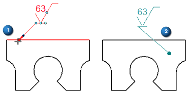 要编辑多段指引线,将指引线 (1) 上插入的顶点拖动到新位置 (2),以更改该线段的方向和位置。使用对齐指示符定向指引线段。