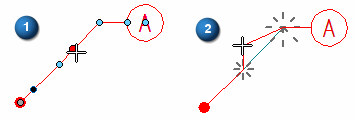 要重新定位端符的连接点同时保持关联性,将连接手柄 (1) 拖动到同一元素上的新位置 (2)。