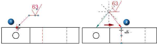要自由更改指引线长度、角度和方向,向任意方向拖动指引线编辑点 (1)。在一条虚线上释放,以对齐该方向 (2)。