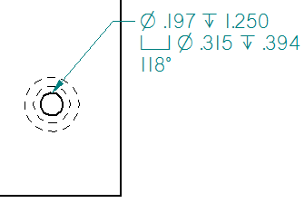 示例:V 型孔底角度 (%V1) 属性文本代码添加到此特征标注的最后一行,引用具有 V 型底的沉头孔。