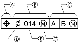 特征控制框由两个或更多个矩形方格组成,它们包含关于公差的信息。第一个方格始终包含几何特性符号。后面的方格包含公差值和代表零件变化量的符号,如最大材料状态。您通过在对话框中输入文本并选择符号来创建特征控制框。