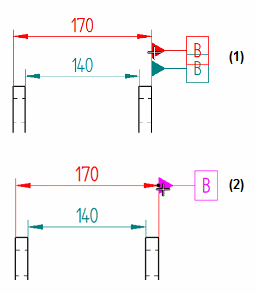 可以拖动基准框或特征控制框的端符 (1),以对齐到其参考的尺寸线 (2)。