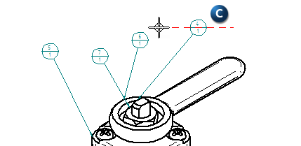 注释:注释对齐形状的第一个点建立后,在未关联注释的附近移动光标 (B) 会自动将注释与对齐形状关联 (C) 起来。