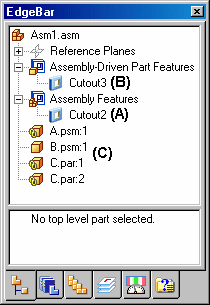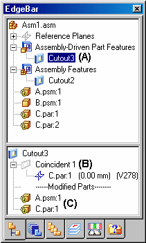 选择路径查找器的上部窗格中基于装配的特征时,控制该特征的父代便显示在路径查找器的下部窗格中。例如,当选择上部窗格中的 Cutout3 (A) 时,在下部窗格中显示 C.PAR 是重合参考平面的父零件,轮廓便是在该参考平面上构造的。还列出由特征修改的零件 (C)。