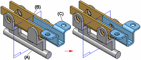 “选择零件步骤”允许您从要修改的零件范围内添加或移除零件。例如,如果原始孔特征仅切穿零件 (A) 和 (B),则可以指定镜像特征也切穿零件 (C)。