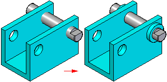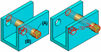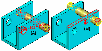 平行关系用于在两个圆柱轴之间、一个圆柱轴与一个线性元素之间以及两个线性元素之间构成关系。例如,可以在所放置零件的圆柱轴 (A) 与装配中已有零件的圆柱轴之间构成平行关系。平行关系相对轴对齐关系的优势在于能够在关系中的零件之间提供移动偏置、浮动或范围。