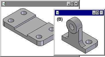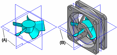 如果操作时“放置零件期间不创建新窗口”选项已清除,零件被放置在装配中后,零件文档中的基本参考平面 (A) 将与装配中的基本参考平面 (B) 重合。