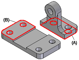 除传统的装配关系外,快速装配选项还减少了使用贴合、面对齐或轴对齐关系定位零件所需的步骤。大多数情况下都推荐使用此选项。例如,可以使用快速装配将放置零件 (A) 上的面与目标零件 (B) 上的面贴合到一起。