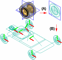 预定义部件是基于现有文档的虚拟部件。不能使用预定义部件来放置 3D 几何体,但是可以在父文档 (A) 中创建 2D 几何体,然后将此 2D 几何体定位在装配草图 (B) 中。您可在新设计项目中重复使用现有文档,而无需 3D 几何结构的开销。