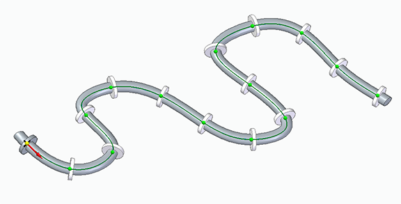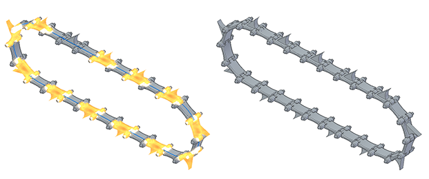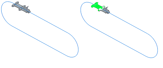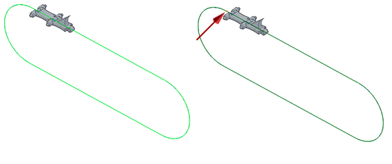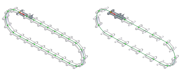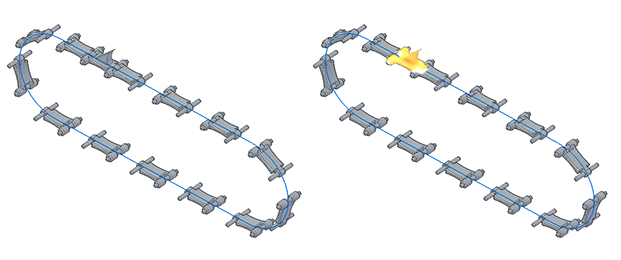 在以下示例中,由两种不同类型的链接组成的链将形成一个环状阵列。已设置这两种链接的装配关系,以成功地跟随蓝色路径。然后选择该链的第一个链接和两个销以进行阵列。