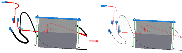 如果装配由包含线束的子装配组成,则可以在单个操作中隐藏所有子装配的线束物理导线。隐藏物理导线后,路径将保持显示状态,路径表示线束的布线。