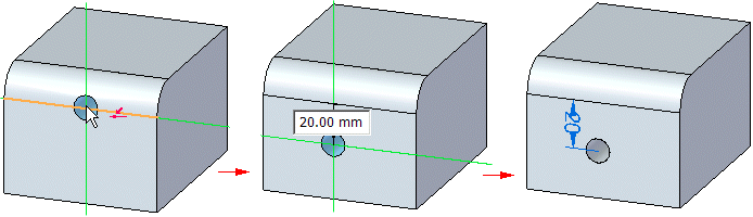 注释:可按下 F3 按钮以锁定到平面。当锁定到平面时,您可以将光标悬停于一条边上,然后单击 E(端点)、C(中心点)或 M(中点)以创建从最近关键点到孔中心的动态尺寸。