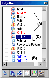 显示选定特征 (C) 的父级 (A) 和子级 (B)。可以在图形窗口或“特征路径查找器”中选择特征。使用“父级特征”和“子级特征”颜色在“特征路径查找器”中显示父级和子级。可以使用“选项”对话框上的“颜色”选项卡设置这些颜色。