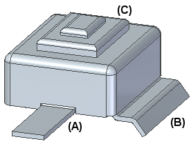 在顺序建模环境中,可以在规则零件的均匀厚度部分添加钣金特征,如弯边 (A)、轮廓弯边 (B) 或凹坑 (C)。