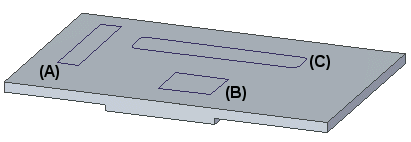 您不能将钣金特征添加到零件,因为选定零件面的其他零件面厚度不同。例如,草图 (A) 和 (B) 处于零件的均匀厚度部分,而草图 (C) 处于零件的不均匀厚度部分。