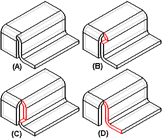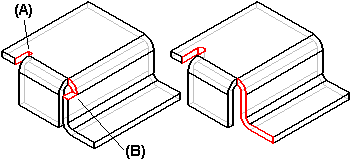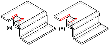 在构造和修改弯边和轮廓弯边时,可以使用“弯边选项”对话框来控制是将折弯止裂口 (A) 还是拐角止裂口 (B) 作为特征的一部分。如果您定义折弯止裂口或拐角止裂口,您也可以控制其大小和形状。