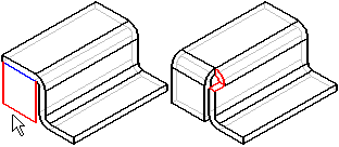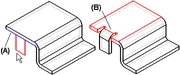 当您指定折弯止裂口时,它应用于构造弯边所使用的源面。例如,在构造位于所选边 (A) 中心的局部弯边时,折弯止裂口添加至弯边两侧的源面 (B)。