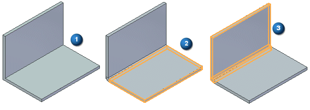 ,可将由均匀厚度 (1) 组成的顺序建模零件或同步建模零件变换为由原生平板 (2) 和弯边 (3) 组成的同步钣金模型。