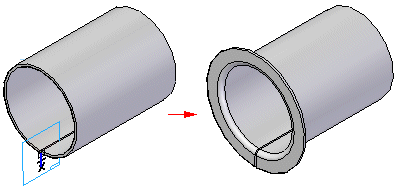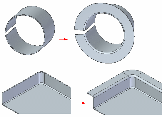 要构造环绕型特征,请使用夹角略小于 360 度的轮廓圆弧。卷型材料的接合端必须要有一个小缝隙,否则,零件将不能展开。在定义轮廓弯边的材料侧时切记这一点。确保材料厚度不会导致缝隙封闭。