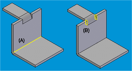 可以使用命令条上的选项来显示按值为零的折弯半径创建的面 (A) 或按系统生成的折弯止裂口创建的面 (B)。