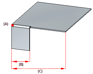 沿选定的面从单击点 (A) 创建长度为 (B) 的部分弯边,其长度 (B) 是选定的厚度面的总长度 (C) 的三分之一。