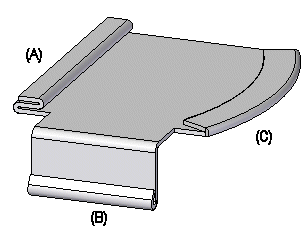 可使用卷边选项对话框指定要创建的卷边类型。“卷边类型”列表中有多种卷边可供选择。例如,您可以定义 s 弯边 (A)、环 (B) 和闭合 (C) 卷边。