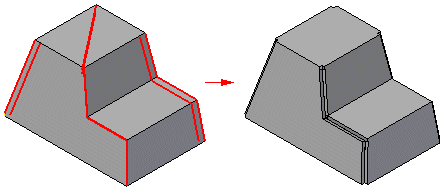 沿曲线进行切操作时,选择的曲线在实体中创建了一个通道并撕开了三个弯曲面之间的角。曲线必须是线性的并完全位于一个平面上。