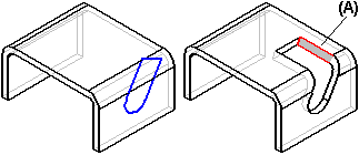在构造钣金件时,可以使用“除料”命令或专门的“法向除料”命令来构造除料。如果构造的除料产生与板面不垂直的厚度面 (A),应考虑使用“法向除料”命令。
