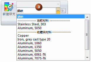 收藏夹列表中的材料将被添加到材料节点 (1) 关联菜单 (2) 和各种命令 (3) 与对话框的材料列表中。