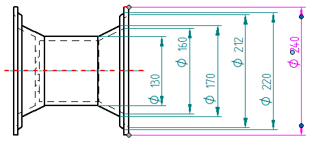 在一个视图中定义中心轴后,您可以通过单击在相同几何体的不同视图上放置对称直径尺寸,如局部放大图。
