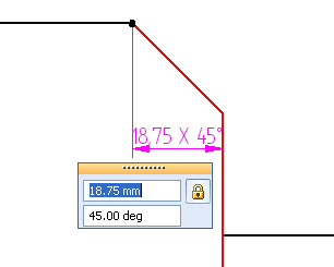 要覆盖倒斜角尺寸值,单击尺寸文本。尺寸值编辑对话框显示当前值。可以在上框中更改线性值,在下框中更改角度值。