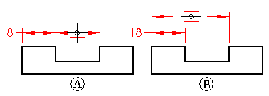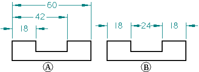 当您使用“间距”或“夹角”命令放置尺寸组时,光标位置确定了将要放置的尺寸组的类型。在将第一个尺寸放入尺寸组中并单击您想测量的第二个元素之后,如果光标位于第一个尺寸下方,则尺寸组将是成链尺寸组 (A)。如果光标位于第一个尺寸上方,则尺寸组将是层叠尺寸组 (B)。