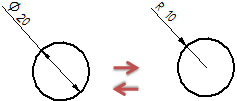 对于直径尺寸或对称直径尺寸,在半显示和完全显示之间切换。