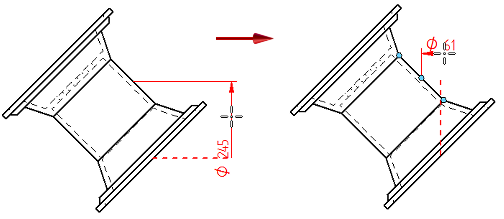 放置一个尺寸来测量物理或隐含中心线与另一个元素或关键点之间的距离,然后将该距离乘以二,并将该值显示为直径。