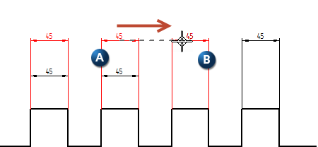 在拖动对齐集 (B) 中的单个尺寸 (A) 时按 Alt 键将仅移动该尺寸。此过程中指出了层叠距离 (C)。