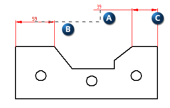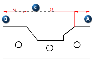 放置一个线性尺寸 (A) 时,可以移到另一个尺寸 (B) 以显示虚线对齐指示符 (C)。当您单击鼠标时,第一个尺寸恰好与第二个尺寸共线对齐。