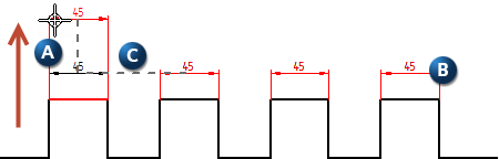 可以使用对齐指示符将尺寸层叠起来。对于层叠的尺寸,将向平行虚线 (B) 附着一条垂直虚线 (A)。 垂直线的方向为向上或向下(取决于位置首选项),并附着到正在创建或修改的尺寸 (C)。层叠尺寸之间的距离由层叠间距设置,它是尺寸文本大小的一个比率。层叠间距可以在尺寸属性对话框或尺寸样式对话框中的线和坐标选项卡中修改。