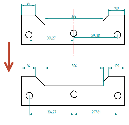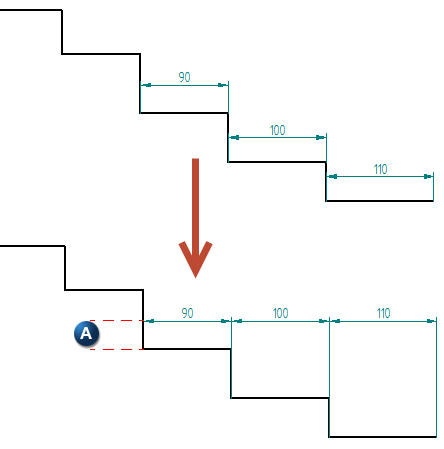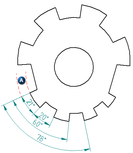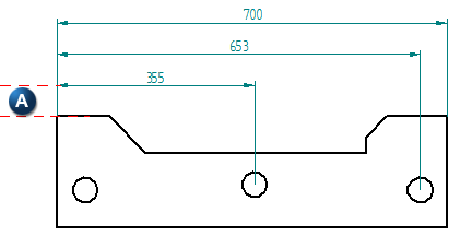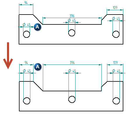 对称直径尺寸 (A) 已对齐,但它们不像线性尺寸那样包含在对齐集中。在具有线性尺寸和对称直径尺寸的图纸中,首先排列对称直径尺寸。