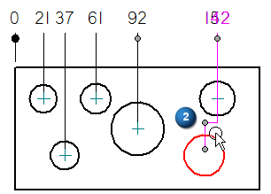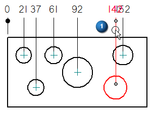 可以在现有的尺寸投影线中手动插入一条或多条折线以改进其格式。使用“选择”命令选择尺寸 (1),然后按住 Alt 键的同时单击鼠标将折线添加到投影线上 (2)。