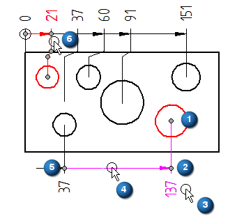 此操作的结果与拖动尺寸线的结果相同 (4),但此手柄即使在不显示尺寸线时仍然可用(根据 ANSI 标准)。 ![]() |