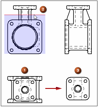 使用“设置图纸视图深度”命令定义背部裁剪平面,用来从图纸视图 (1) 移除几何体。要在与其呈 90 度的视图中定义平面,可以单击关键点或中心线 (2)。当更新该视图时,几何体会被移除 (3)。