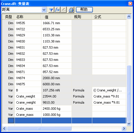 系统生成变量、用户定义变量以及值都保存在变量表中。变量表定义设计中变量和尺寸之间的函数关系。使用“面积”命令创建面积对象时,在变量表中自动生成一组相应的变量和当前值。类似地,在草图或轮廓元素上放置驱动尺寸时,将生成尺寸变量和值。