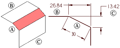 例如,如果将深度指定为 30 mm,将值条目指定为 0.50,则将构造一个长度为 30 mm 的倒圆面。值条目 0.50 表明要定位新倒圆面 (A),则要从所选的第一个面 (B) 上除去的材料为从所选的第二个面 (C) 上所除料的两倍。在两个平面互相垂直的情况下,从面 (B) 上除去 26.84 mm,从面 (C) 上除去 13.42 mm。可以键入一个大于 0 但小于等于 10.0 的值。值条目 1.0 将创建 45 度的斜角。