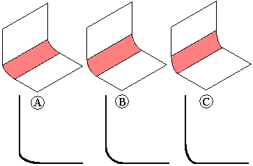 二次曲线选项可构造固定的椭圆形横截面倒圆。设置此选项时,半径值将定义横截面的宽度,键入的值条目将改变横截面形状。可输入大于但不等于零的值条目。值条目越接近 0.0,则横截面将变得越扁平且越与倒斜角 (A) 相似。随着值条目的增大,横截面将越来越圆 (B),然后再次变扁平 (C)。