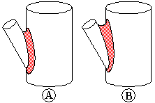 恒定宽度选项可在具有恒定倒圆弦宽 (A) 的两组表面之间创建倒圆。当一表面与另一表面以一定角度相交,而使用恒定半径倒圆 (B) 可能需要添加过多或过少的材料时,此选项很有用。