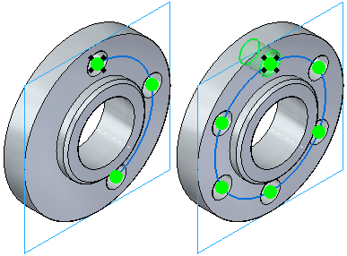 例如,您可以创建一个完整的圆形阵列,角度间距为 47 度,且模式中总计仍有 8 个事例,因为 7 乘以 47 等于 329。最后一个事例与父特征之间的角度间距为 31 度。