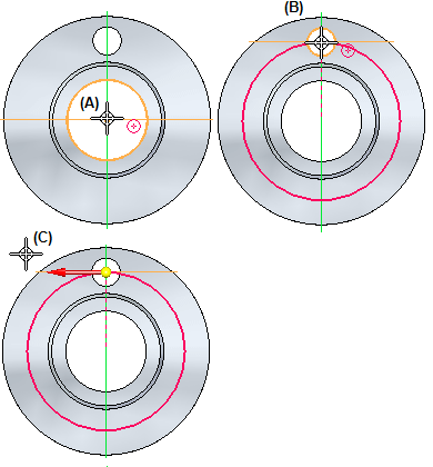 当绘制阵列弧或阵列圆时,请指定中心点 (A)、起始点 (B) 和方向 (C)。