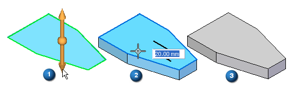 命令条包含构造各种各样的拉伸特征所需的选项。要开始特征构造过程,请将光标定位于拉伸手柄的箭头上并单击 (1)。