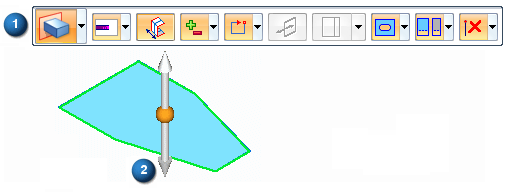 在同步建模环境中,可以使用选择工具构造拉伸特征。当您选择了有效的草图元素(例如草图区域)时,将显示拉伸命令条 (1) 和拉伸手柄 (2)。