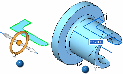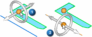 您可以通过单击手柄原点 (1) 来移动旋转手柄,这样会使旋转手柄连接到光标。然后您可以将手柄定位在轴元素上。旋转手柄会迅速与任何线性元素对齐。当旋转手柄与恰当的元素对齐时,您可以单击以接受该手柄位置 (2)。